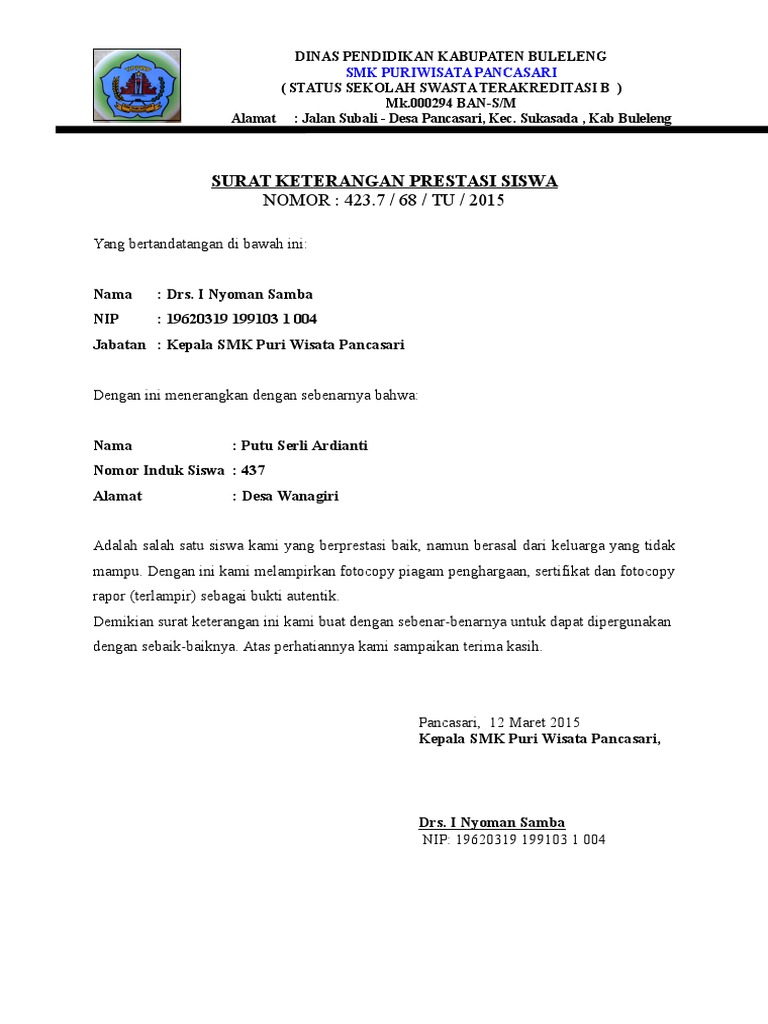 Surat Keterangan Prestasi Siswa Yang Baik Dan Benar